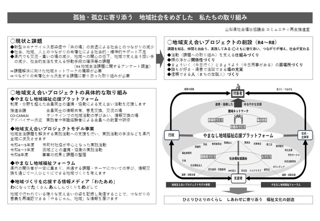 ABOUT US 2024.09.18 私たちの取り組み(やまなし地域支え合いコミュニティ再生推進事業について) 山梨県社会福祉協議会では孤独・孤立に寄り添う地域社会を目指し、「ひとりひとりのくらし しあわせに寄り添う 福祉文化の創造」というビジョンを掲げ、令和4年度より「やまなし地域支え合いコミュニティ再生推進事業」に取り組んでいます。 上記の活動を通じて、県内の多様な人々とのゆるやかなネットワークづくりに取り組んでいきます。 一覧へ